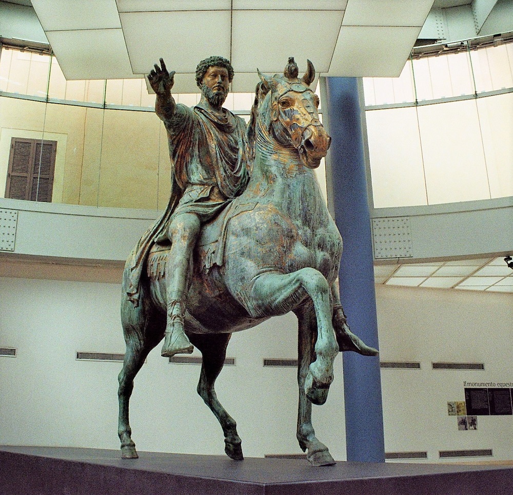 A Estátua equestre de Marco Aurélio é uma estátua romana antiga no Capitólio de Roma, na Itália. É uma estátua equestre de bronze com 4,24 metros de altura. Embora o imperador esteja montado, ela apresenta muitas similaridades com as tradicionais estátuas em pé de Augusto. A original está abrigada nos Museus Capitolinos e a versão atual, instalada ao ar livre na Piazza del Campidoglio, é uma réplica feita em 1981, quando a original foi removida para restauro. O tema geral da obra é o do poder e da grandeza divina — o imperador está representado em grandes dimensões e está gesticulando com a mão, como fazia Augusto nos seus retratos. Ele cavalga sem estribos, uma inovação oriental que ainda não tinha chegado ao ocidente. |