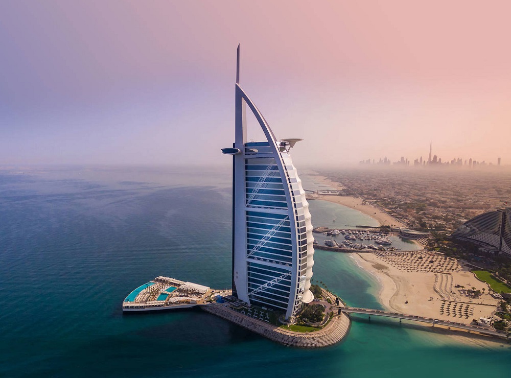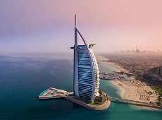 O Burj Al Arab é um luxuoso hotel edificado em Dubai, Emirados Árabes Unidos (EAU). O Burj Al Arab é operado pelo Jumeirah Group e foi construído por Said Khalil. Com 231 metros, ele foi projetado por Tom Wright da WS Atkins PLC para ser o maior arranha-céu do mundo, passando a Torre Eiffel. Entretanto, o prédio acabou perdendo o título para outros, como a torre da Sears Willis Tower e o Burj Khalifa. Ele foi construído para assemelhar-se com a vela de um dhow, um tipo de barco Árabe. Duas colunas partindo do chão até o topo originaram um "V" formando um imenso "mastro", enquanto que o espaço entre elas foi erguido os andares. |