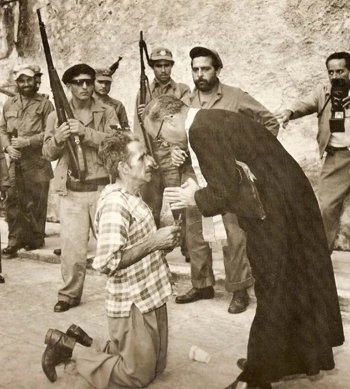 A imagem vencedora do prêmio Pulitzer em 1960 mostra um ex-membro do exército do ditador cubano deposto Fulgencio Batista, pouco antes de ser executado por um pelotão de fuzilamento de Fidel Castro. O condenado recebe os sacramentos finais. |