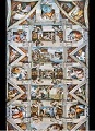 Os vários elementos pintados no teto da capela são parte de um plano maior de decoração, o qual inclui outro grande afresco, o Juízo Final, na parede do altar do santuário, também obra de Michelangelo, além de outras pinturas de parede feitas por vários importantes artistas do final do século XV, como Sandro Botticelli, Domenico Ghirlandaio e Pietro Perugino, e tapeçarias de Rafael. O conjunto ilustra diversas passagens da Bíblia e da doutrina católica. Centrais no teto, estão nove cenas do Gênesis, dentre as quais A Criação de Adão é a mais famosa, tendo uma representatividade icônica igualada somente pela Mona Lisa, de Leonardo da Vinci. Um símbolo da influência desse painel do afresco é o detalhe do encontro das mãos de Deus e Adão, reproduzido incontáveis vezes na arte e na cultura popular. O complexo grupo de desenhos inclui vários conjuntos de figura humana, tanto vestida quanto desnuda, que permitiram a Michelangelo demonstrar plenamente sua habilidade de criação em grande variedade de composições, além de terem inspirado gerações de artistas desde então. |