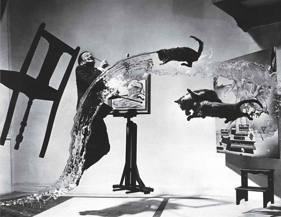 Foi em 1948, ainda não existiam os retoques digitais, nem os programas de edição de fotografia, nem computadores, nada. Somente se utilizou uma película analógica, emulsões para revelar, uma câmera de formato médio e algumas ideias para aproveitar ao máximo os recursos. Salvador Dalí e o fotógrafo Philippe Halsman se uniram para desenhar uma imagem impossível, inspirada em Leda atômica, uma obra que, segundo Dalí, era a chave para a vida: cada elemento estava suspenso no espaço, sem que nenhuma coisa tocasse outra. O título da fotografia: Dalí Atomicus.Uma das tentativas de “Dalí Atomicus”. Trabalharam uma semana no esboço, no estúdio que Halsman tinha em Nova York. O objetivo era conseguir que nenhum elemento tivesse o apoio e que tivesse uma presença forte do movimento sem perder o equilíbrio na composição. Decidiram situar uma reprodução de Leda atômica na margem direita, utilizar três gatos, leite, dois cavaletes e uma cadeira. Dalí, com um pincel em sua mão direita, seria a única pessoa que apareceria na foto. No último momento decidiram substituir o leite pela água. Não sabiam quantas tomas teriam que realizar e necessitavam mais de cinco litros de água por tentativa. A partir de um sistema de polias, ataram ao teto os cavaletes e o quadro com fios transparentes. Um assistente era encarregado de deixar cair os fios no momento de fazer a foto. Yvonne Halsman, esposa do fotógrafo, tinha a cadeira na mão, sobre a margem esquerda, com o corpo retirado para que não aparecesse na fotografia. Outros três assistentes lançavam os gatos. E uma quinta pessoa se encarregava de jogar no ar, de baixo para cima, e da esquerda para a direita, um balde de água. |