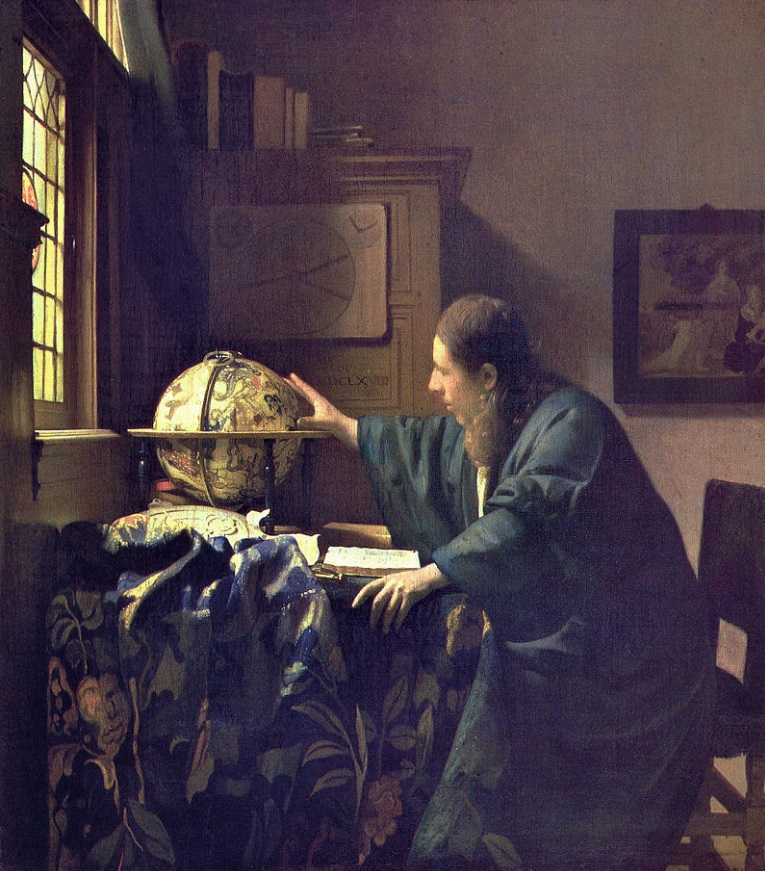 O Astrónomo é uma pintura a óleo sobre tela do mestre holandês Johannes Vermeer, datada de 1668 e conservada no Museu do Louvre em Paris. O nosso astrónomo, numa modalidade característica do retrato de sábio, não está ao telescópio, que não está sequer representado; em vez disso, ele parece estar à procura no globo as constelações e os corpos celestes que estão descritos no livro que tem à sua frente. Em cima da mesa pode ver-se também um astrolábio plano, importante instrumento da astronomia e da navegação, porquanto permite obter, com base na posição dos astros, as próprias coordenadas geográficas. |