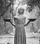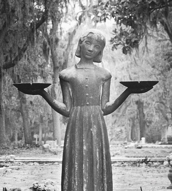 A escultura, conhecida como a Menina Pássaro, foi criada em 1936, pela escultora Sylvia Judson Shaw (1897-1978), em Lake Forest, Illinois. Ele alcançou a fama quando foi destaque na capa do romance de 1994, Meia-Noite no Jardim do Bem e do Mal. Foi esculpida em Ragdale, a casa de veraneio de sua família. A Menina Pássaro foi fundida em bronze e tem 50 centímetros de altura. Ela é a imagem de uma jovem usando um vestido simples e uma expressão triste e contemplativa, com a cabeça inclinada para a esquerda. Ela permanece em linha reta, os cotovelos apoiados contra sua cintura enquanto ela segura duas tigelas. As bacias são frequentemente descritos pelos telespectadores como "alimentadores de pássaros." Primeiramente colocada no cemitério de Bonaventure, após o sucesso do livro que gerou também um filme, conforme aumentaram as visitas ao cemitério por causa da estátua (inclusive tendo o cemitério entrado no roteiro oficial de visitas de Savannah), a mesma foi transferida para o Museu Histórico de Savannah. |
