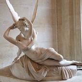 “Psique Reanimada pelo Beijo do amor” é uma escultura do artista italiano Antônio Canova, encomendada pela primeira vez em 1787 pelo coronel John Campbell. A obra se encontra exposta no Museu do Louvre, em Paris. Segundo a lenda do autor romano Apuleio, em suas Metamorfoses, “O Asno de Ouro”, nos diz que os Deuses realizaram um conselho concedendo a mão de Psiquê ao deus do Amor, dando a ela a imortalidade e o status de deusa da Alma. O jovem homem alado visto encima de uma rocha abraçando uma garota inconsciente, é o deus do Amor, (Eros ou Cupido em latim) reconhecível por suas asas e seu estojo cheio de flechas. A garota é Psiquê, filha de um rei de Mileto, muito invejada por Vênus por sua beleza que a enviou para uma missão no submundo da terra buscar um frasco que continua a beleza das deusas guardado por Perséfone, e com a proibição de abri-lo. Curiosa e não respeitando as ordens abriu e caiu num sono profundo. O Amor, vendo Psiquê sem praticamente sem vida, procura salvá-la com ajuda de Zeus que aceita seu pedido. Ordena que Hades traga-a de volta e a deixe no alto de uma montanha no Olimpo. Cuidadosamente o Amor abraça a jovem Psiquê dando-lhe uma beijo para traze-la de volta a vida. |