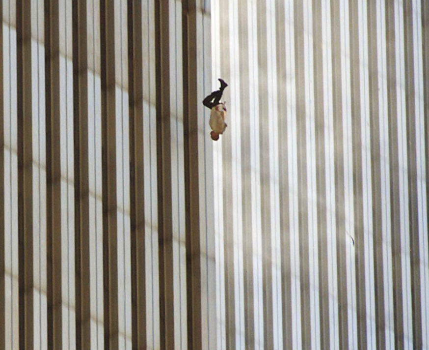 Tirada durante os ataques de 11 de setembro de 2001, a foto mostra um homem caindo de uma das torres gêmeas do World Trade Center. Várias pessoas pularam no vazio para evitar asfixia com os gases tóxicos dos andares próximos ao impacto da aeronave. |