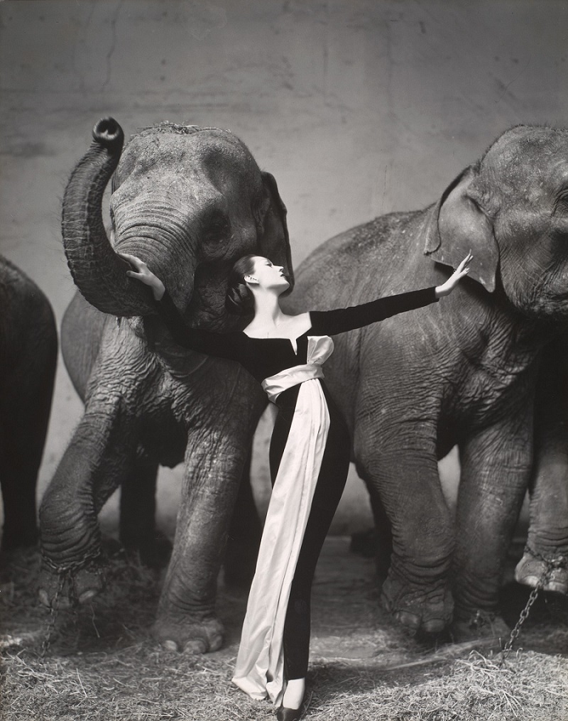Dovima with Elephants é uma produção de Richard Avedon no Cirque d'hiver em Paris, que tem um telhado de vidro que permite a entrada de luz natural. Apresenta a modelo americana Dovima posando entre vários elefantes em um vestido de noite preto projetado para o estilista francês Christian Dior por seu jovem assistente, Yves Saint-Laurent , com a seguinte descrição: «Veludo preto bainha. Mangas muito justas e decote profundo. Cinto largo de cetim drapeado, colocado acima da cintura normal ”.