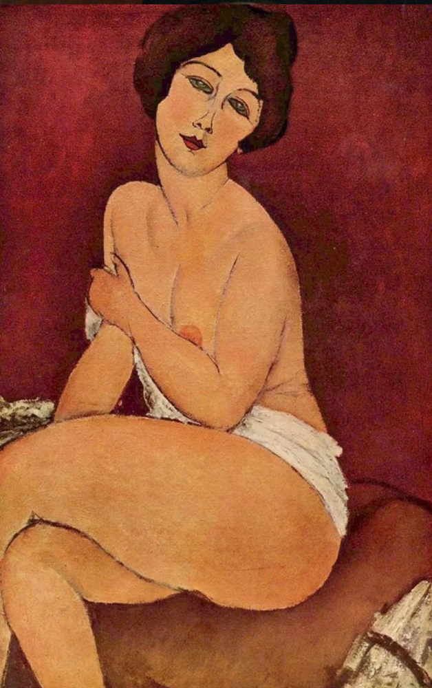 Nude sentado em um divã ( a bela mulher romana ) é um óleo sobre tela do artista italiano amedeo modigliani, representando uma mulher parcialmente drapeada, sentada com as pernas cruzadas contra um fundo vermelho quente . o trabalho foi um de uma série de nus pintados por modigliani em 1917 que criou uma sensação quando exibido em paris naquele ano . em novembro 2 , 2010 , a pintura vendida em um leilão de nova york por $68 . 9 milhão , um preço recorde para uma obra de arte de modigliani. |