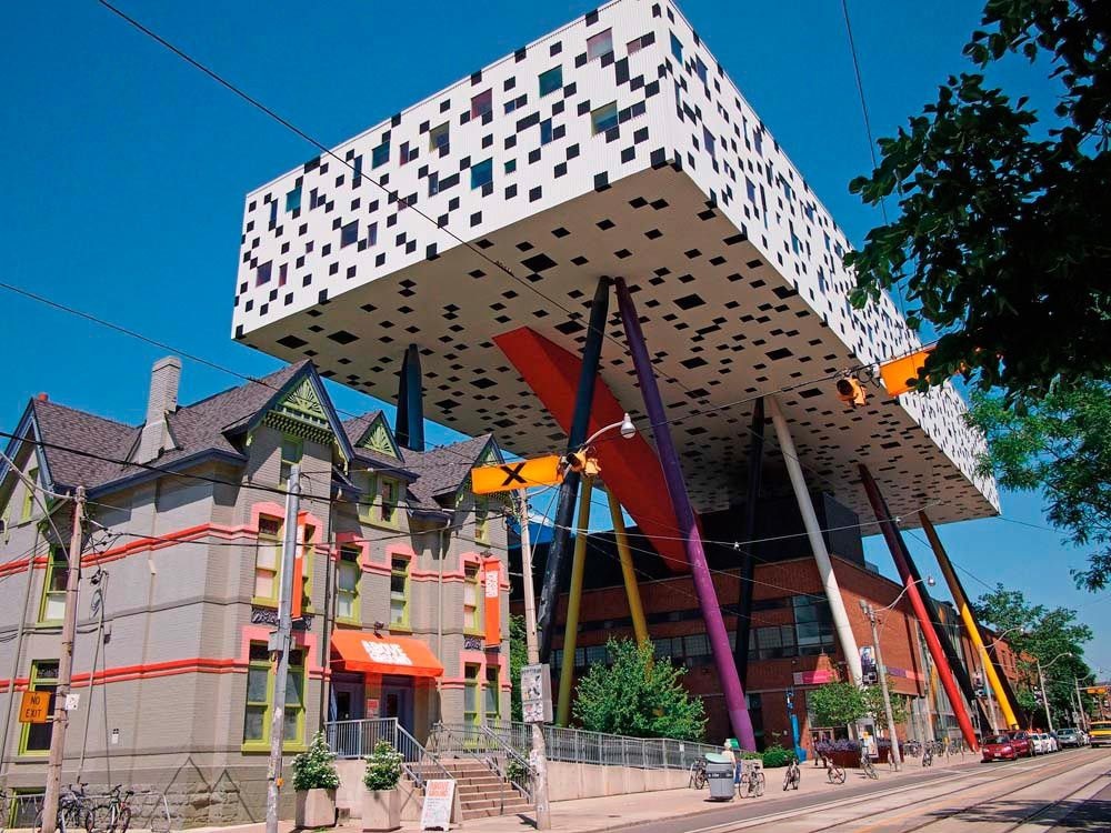 Em 2000, o financiamento foi obtido do programa SuperBuild de Ontário para construir uma quinta extensão do Edifício Principal. Por meio de Rod Robbie da Robbie / Young + Wright Architects, Will Alsop da Alsop Architects tomou conhecimento do projeto e foi selecionado em 2002. Uma joint venture foi formada entre as duas empresas e a nova extensão, agora conhecida como Sharp Center for Design, foi concluída em 2004. O design, que surgiu de um processo de design participativo, consiste em uma caixa de quatro andares acima do solo suportada por uma série de pilares multicoloridos em diferentes ângulos e é freqüentemente descrita como uma mesa. A expansão e redesenvolvimento de $ 42,5 milhões receberam vários prêmios, incluindo o primeiro Prêmio Mundial do Royal Institute of British Architects, o prêmio de excelência na categoria "Building in Context" na Toronto Architecture and Urban Design Awards, e foi considerado o projeto técnico de maior destaque em 2005 no Canadian Consulting Engineering Awards. |