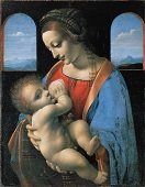 Madona Litta (têmpera sobre tela) é uma pintura do início do século XV atribuída por muitos investigadores a Leonardo da Vinci, enquanto outros pensam que pode ter sido pintado por um de seus seguidores, como Giovanni Antonio Boltraffio ou Marco d'Oggiono, uma vez que a técnica apresentada na obra não corresponde à utilizada pelo artista. De seguro, esta obra foi pintado em Milão e encontra-se atualmente no Museu Hermitage São Petersburgo. Trata-se da representação da Virgem Maria amamentando o menino Jesus, um assunto devocional conhecido como a Virgem Amamentando. A pintura leva esse nome por conta da Casa de Litta, uma nobre família milanesa para a qual foi grande parte da coleção artística da época. A obra é divida apenas em dois planos e é apresentada na posição vertical. No centro, está a Madona amamentando um bebê enquanto olha para ele, já a criança encara fixamente o observador. Ambos os personagens têm expressões faciais com ampla carga emotiva. |