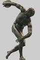 O Discóbolo (do grego Diskobólos, lançador de disco) é uma estátua do escultor grego Míron, que representa um atleta momentos antes de lançar um disco. Provavelmente seja a estátua de desportista em ação mais famosa do mundo. Segundo nos dizem Plínio, o Velho e Luciano de Samósata, o original fora produzido em bronze em torno de 455 a.C para ser instalado em um palácio de Atenas, possivelmente criado para comemorar um atleta vitorioso no antigo pentatlo, mas a obra acabou se perdendo ao longo do tempo. A composição no entanto sobrevive em diversas cópias romanas, todas com variações entre si, o que deixa algumas dúvidas sobre a conformação exata do original. Estilisticamente o Discóbolo ilustra a transição do Estilo Severo para o Estilo Clássico. A descrição anatômica tem um caráter mais naturalista do que a idealização praticada pelos seus antecessores imediatos, e apesar de dinâmica, é mais ou menos confinada dentro do plano frontal, à maneira de um alto-relevo. A vanguarda da escultura grega logo após Míron se tornou celebrada por dar a verdadeira independência tridimensional à escultura, criando obras igualmente eficientes em todos os ângulos. Essas características, se lhe dão um caráter transicional, não lhe retiram mérito próprio como obra perfeitamente acabada sob todos os aspectos, quando analisada no contexto de seu próprio momento histórico e cultural. Sob outro ponto de vista, Míron foi um pioneiro justamente pela introdução de uma abordagem anatômica e cinesiológica mais próxima do natural, e por ter conseguido sintetizar em arte um ideal de beleza física, de equilíbrio dinâmico e de harmonia entre mente e corpo, antecipando em muitos aspectos a produção de Fídias e Policleto. Na representação de atletas, a composição de Míron foi uma completa novidade. A questão do ilusionismo como recurso artístico, que se tornou tão cara aos gregos clássicos, fica mais evidente quando sabemos que, de acordo com os estudos atuais, embora o Discóbolo tenha enorme qualidade como obra de arte e tenha se tornado um modelo na representação do movimento do corpo humano, não representa o movimento real que o atleta faz no ato de lançar o disco. A quantidade de cópias conhecidas indica que a obra foi muito popular na Roma Antiga. |