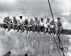 Almoço no topo de um arranha-céu é uma famosa fotografia em preto e branco tirada durante a construção de um edifício na cidade de Nova York, nos Estados Unidos. A imagem mostra oito homens sentados a 256 metros de altura e sem nenhuma proteção, fato que foi ligado à Grande Depressão, quando as pessoas estavam dispostas a aceitar qualquer trabalho, mesmo que tivessem que abrir mão da própria segurança. A partir de 2003, a fotografia passou a ser creditada a Charles C. Ebbets e teria sido feita em 20 de setembro de 1932. |