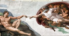 Esta imagem é possivelmente um dos grandes ícones da arte ocidental. Michelangelo pintou Adão como se ele estivesse acabando de acordar, prestes a receber a energia da vida da mão estendida de Deus, que está suspenso, mas acima envolto por uma nuvem de anjos. A história humana começa nesse instante capturado brilhantemente. É a antecipação do momento que dá à pintura essa tensão e vitalidade.