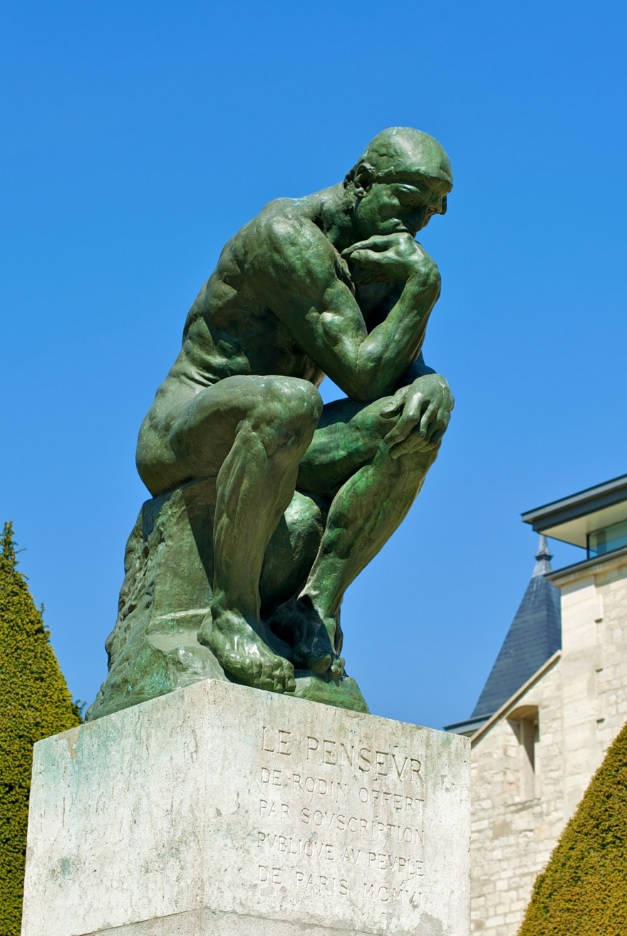 Quando concebido em 1880 em seu tamanho original,70 cm (mas em 1904 Rodin decidiu ampliá-la para 1,80). como o elemento culminante de “As Portas do Inf rno”, O Pensador representava Dante, autor da Divina Comédia, inclinando-se para observar os círculos do Inf rno, enquanto meditava em seu trabalho. O Pensador foi, portanto, inicialmente, tanto um ser com um corpo torturado, quase uma alma condenada, e um homem de pensamento livre, decidido a ultrapassar o seu sofrimento através da poesia.