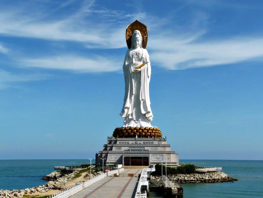 A força do budismo nos países orientais pode ser percebida quando analisamos a quantidade de grandiosas estátuas construídas nessas nações para homenagear figuras importantes de sua fé. Tanto é que a quarta posição dessa lista também é ocupada pela representação de uma deidade budista: novamente a Guanyin, forma feminina do Bodisatva da Compaixão. A devoção a essa deidade é particularmente forte na China, e talvez por isso o país tenha se empenhado em construir uma representação tão elaborada de Guanyin. A bela escultura de 108 metros de altura está situada na costa da província de Hainan, próxima do Templo Nashan da cidade de Sanya. Ela tem três aspectos: o primeiro deles, voltado para a terra, mostra Guanyin olhando por todos aqueles que se aproximam; o segundo e o terceiro estão voltados para o mar da China, simbolizando que a bodisatva direciona suas bênçãos e proteção não apenas para nação chinesa, mas para todo o mundo. De todas as representações budistas de Guanyin, essa é a maior e a mais conhecida.